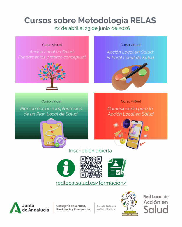 La Red Local de Acción en Salud (RELAS), de la Dirección General de Salud Pública y Ordenación Farmacéutica de la Consejería de Salud y Consumo, ha iniciado una nueva edición de los cuatro cursos virtuales para formar en los fundamentos y la metodología de elaboración de los planes locales de salud. Las actividades formativas están disponibles de forma continua en la plataforma de docencia de la Escuela Andaluza de Salud Pública.