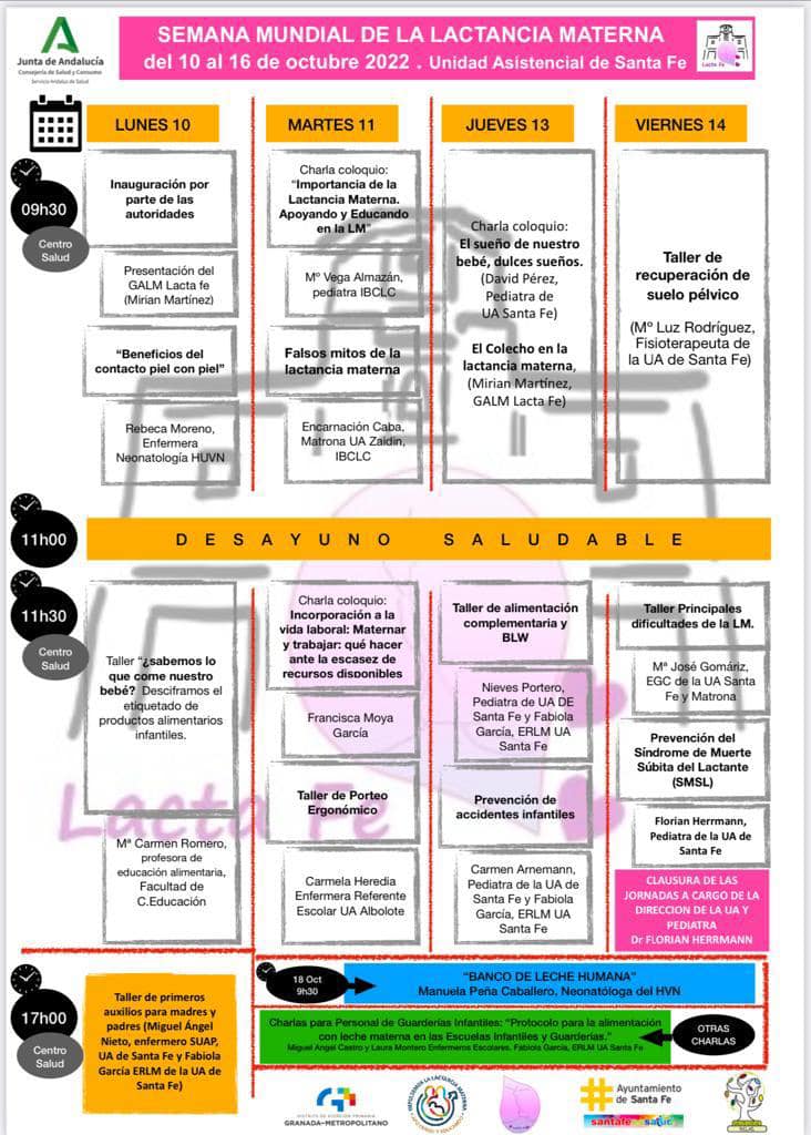 Desde la Unidad Asistencial de Santa Fe, en colaboración con el Área de Salud de nuestro Ayuntamiento, se han organizado las Jornadas sobre Lactancia Materna, junto al grupo de madres LactaFe, en nuestro Centro de Salud de Santa Fe. Del 10 al 16 de octubre, coincidiendo con la conmemoración de la Semana Mundial de la Lactancia Materna. Unas jornadas con una duración de cuatro días y una magnífica programación con charlas y talleres impartidos por grandes profesionales.