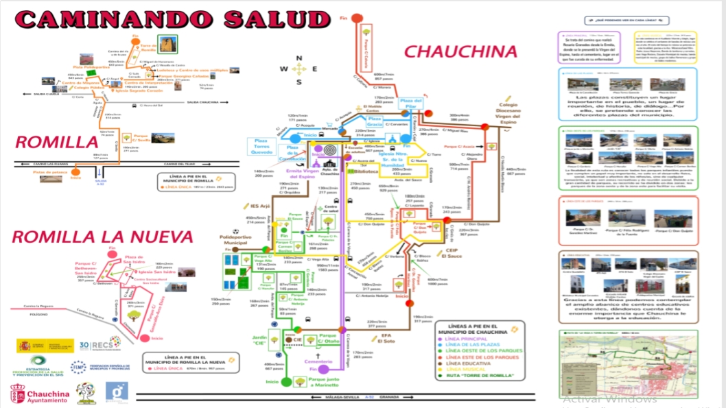 Se ponen en marcha varias lineas de metro imaginarias plasmadas en varios carteles ubicados en lugares estratégicos de las localidad, así como planos guía de mano, para fomentar la practica de ir andando por el municipio, así se van ubicando, localizando y conociendo cuales son nuestros recursos y activos en salud, además de poder ir añadiendo todos aquellos que consideramos oportunos que reporten salud, calidad de vida, bienestar,...y sobre todo, respeto por nuestro entorno medioambiental.