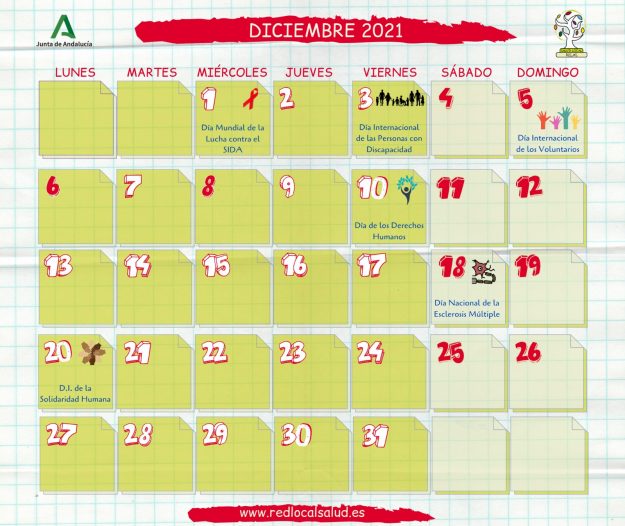 Desde la Red de Acción Local en Salud compartimos el calendario del mes de diciembre de 2021, que marca los Días Mundiales más destacados y pueden servir para organizar actividades en los municipios
