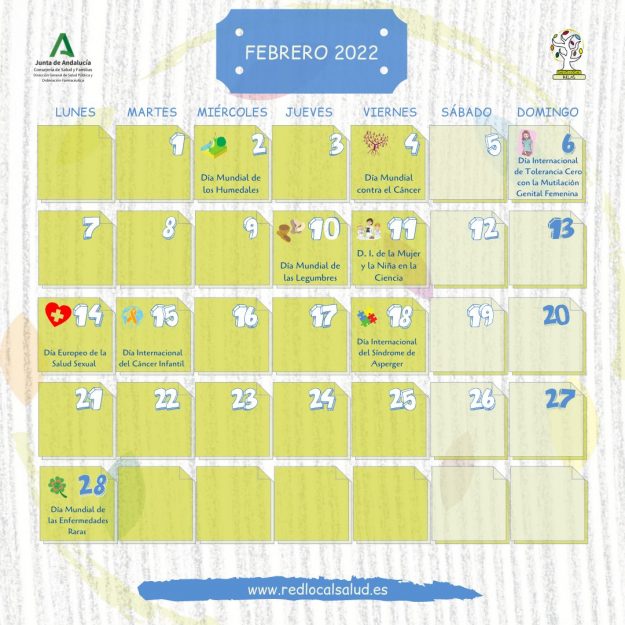 Desde la Red de Acción Local en Salud compartimos el calendario del mes de febrero de 2022, que marca los Días Mundiales más destacados y pueden servir para organizar actividades en los municipios