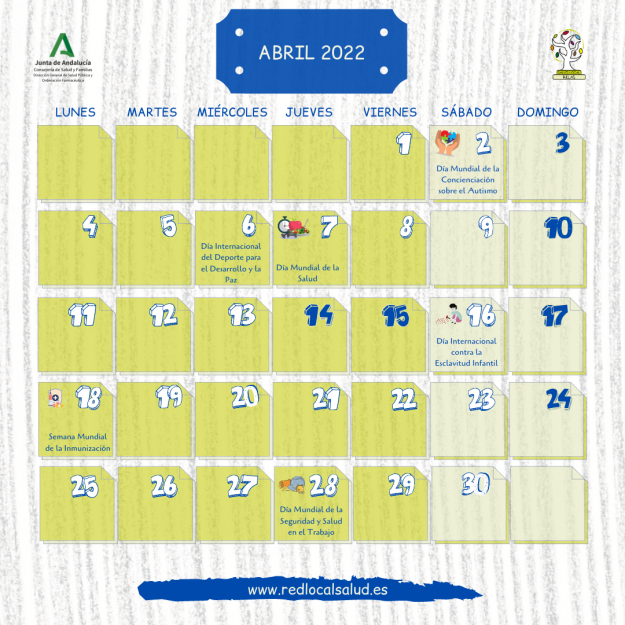 Desde la Red de Acción Local en Salud compartimos el calendario del mes de abril de 2022, que marca los Días Mundiales más destacados y pueden servir para organizar actividades en los municipios
