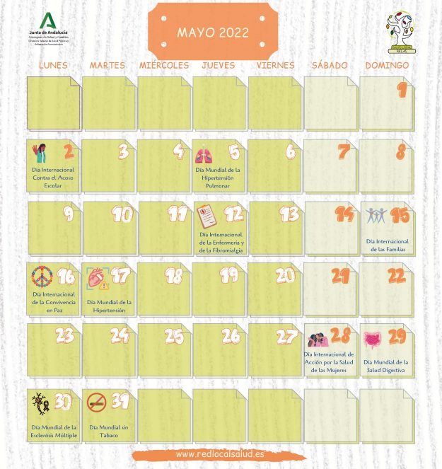 Desde la Red de Acción Local en Salud compartimos el calendario del mes de mayo de 2022, que marca los Días Mundiales más destacados y pueden servir para organizar actividades en los municipios
