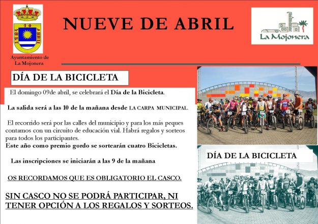 El Ayuntamiento de La Mojonera organiza el Día de la Bicicleta el 9 de abril. A partir de las 10 horas dará comienzo un recorrido que tiene su salida desde la Carpa Municipal y que discurre por las calles del municipio.