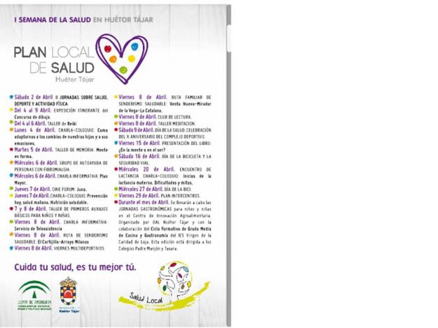 El municipio de Huetor Tajar apuesta por la salud, y en este año 2017 organiza la III Semana de la Salud con objeto de poner en valor los activos en salud del municipio, como difusión del futuro plan local de salud de su municipio. Enlace web Huétor Tájar recibe el mes de abril con la…